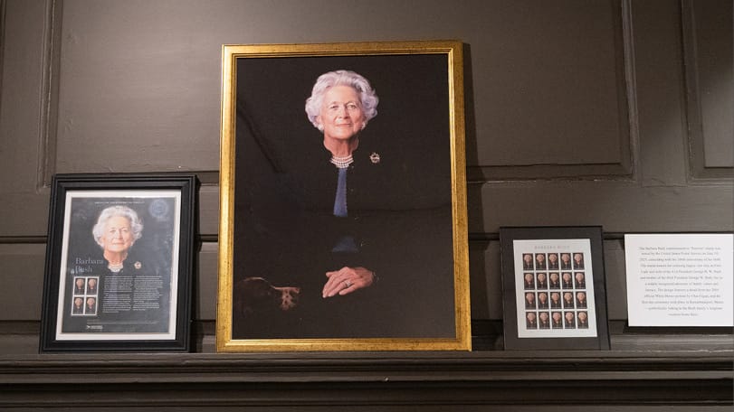 Draped in her signature purple shawl and pearls at her throat, former First Lady and Rye native Barbara Bush’s warm expression and steady posture greet visitors at an exhibit honoring her.
