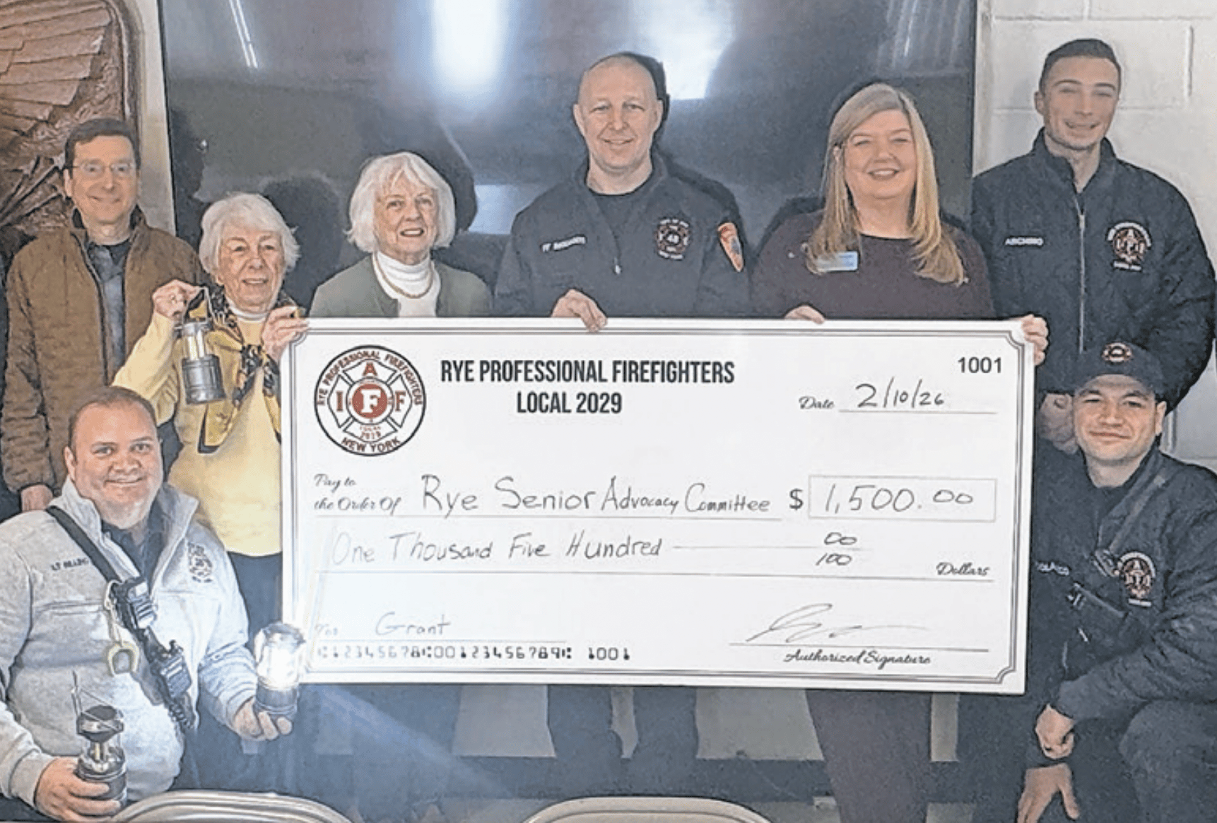 Rye Professional Firefighters Local 2029 presented a $1,500 grant to the Rye Senior Advocacy Committee, which funded the donation of lanterns to seniors at Rye Manor and Vienna Housing.